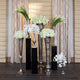 An inspiring and impressive all white arrangement with the seasons best flowers designed in a modern clear glass moon vase. Pictured with an assortment of hydrangea, orchids, roses, mini callas and willow.