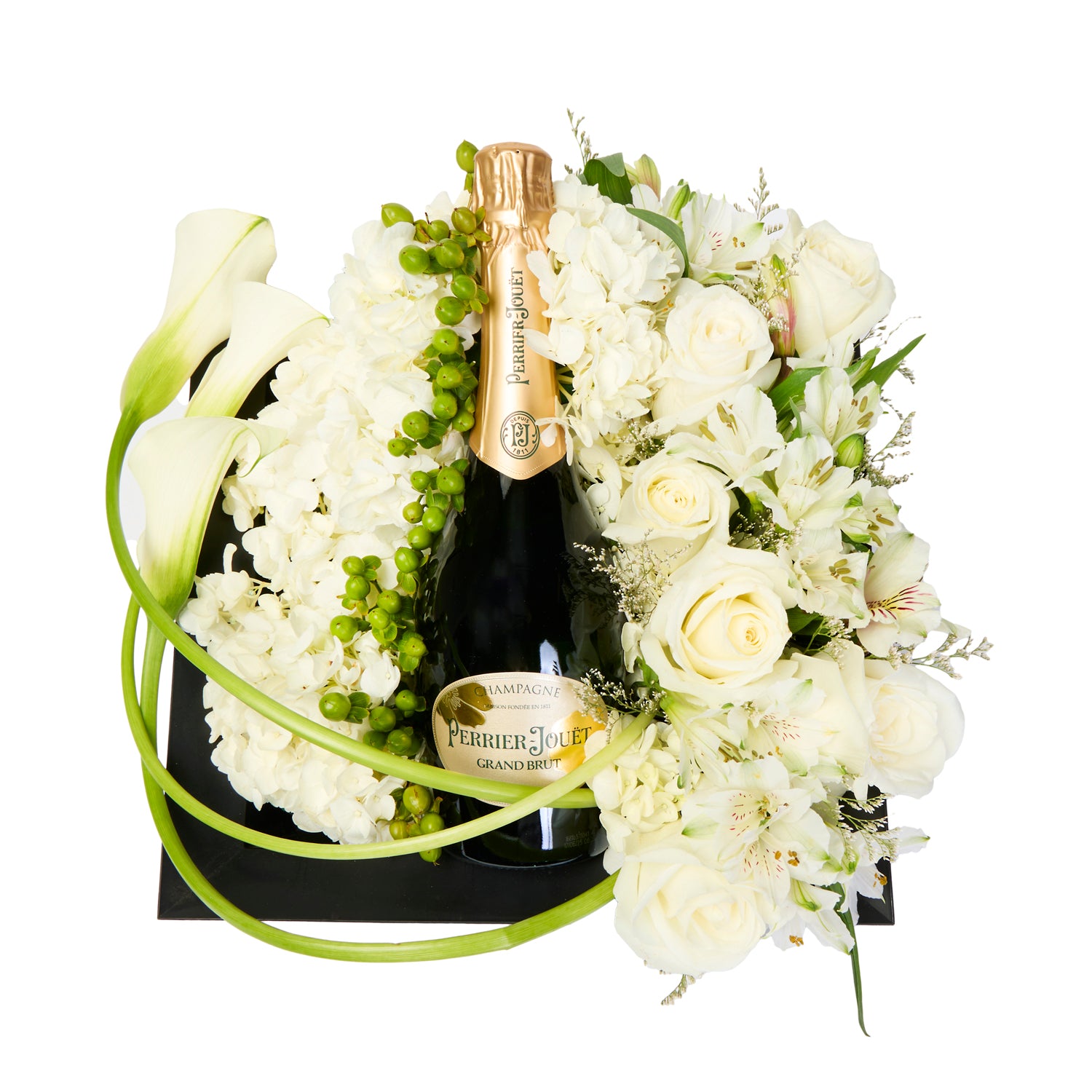 Jenn is an exquisite contemporary flower box design of white hydrangea, calla lilies, roses and assorted foliage. Nestled in the center of this arrangement is a full-size bottle of chilled Perrier Jouet Brut Champagne