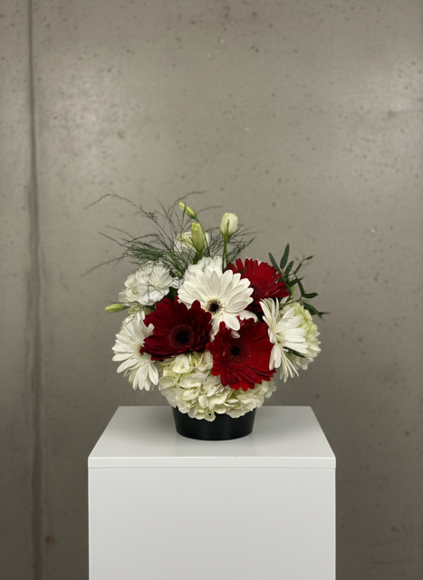 ***ON SITE VENDOR***Small arrangement approx. 12”x12”  in black ceramic vase. Mix of hydrangea, Gerbera daisies, Cremones, LizzianthusSubstitution PolicyWe hand-design each arrangement as close to the picture as possible. Similar substitutions may be made for flowers or container, depending on availability.
