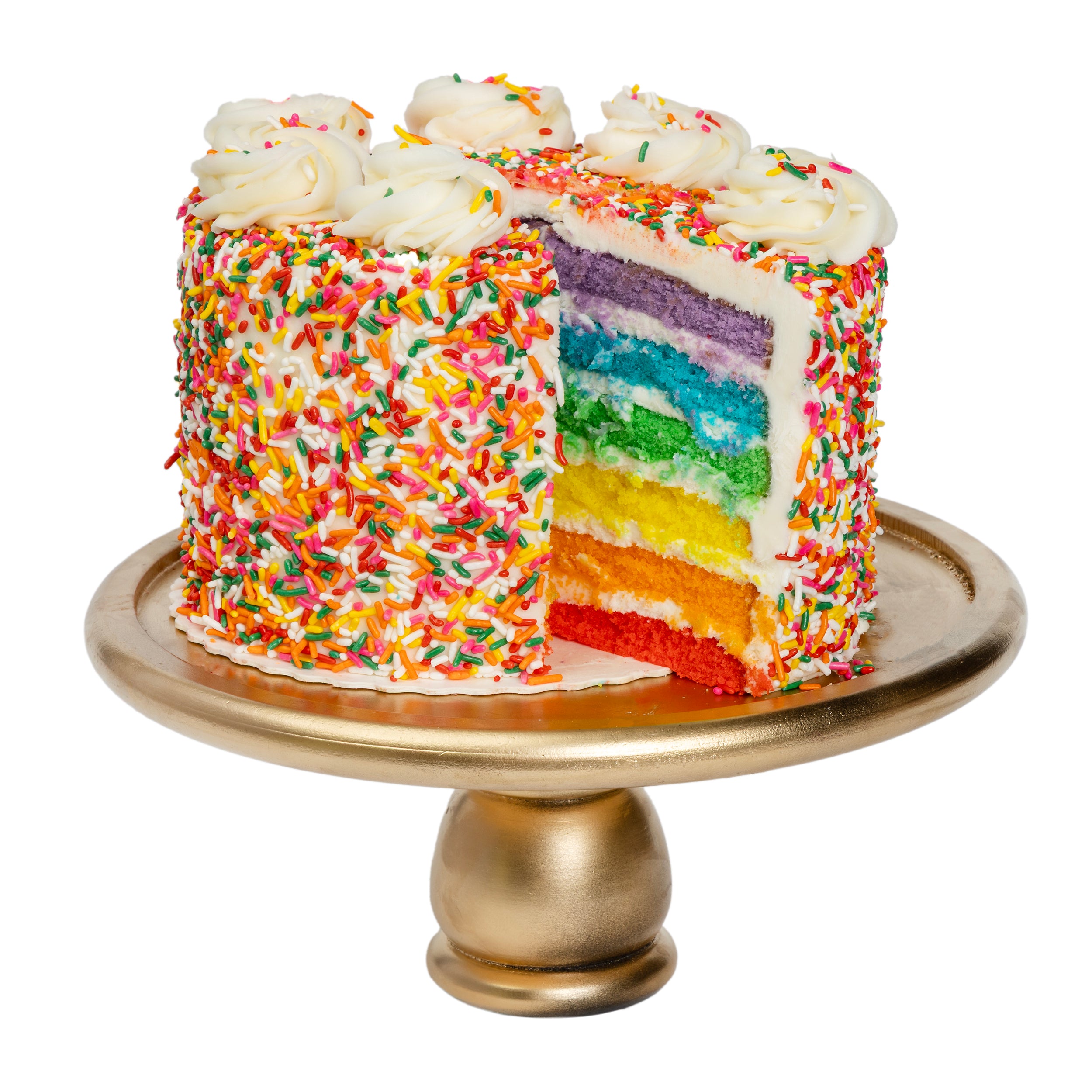 Six layers of rainbow-colored vanilla cake filled high with sweet vanilla icing and covered in rainbow sprinkles.