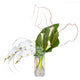 An inspiring and impressive all white arrangement with the seasons best flowers designed in a modern clear glass moon vase. Pictured with an assortment of hydrangea, orchids, roses, mini callas and willow.