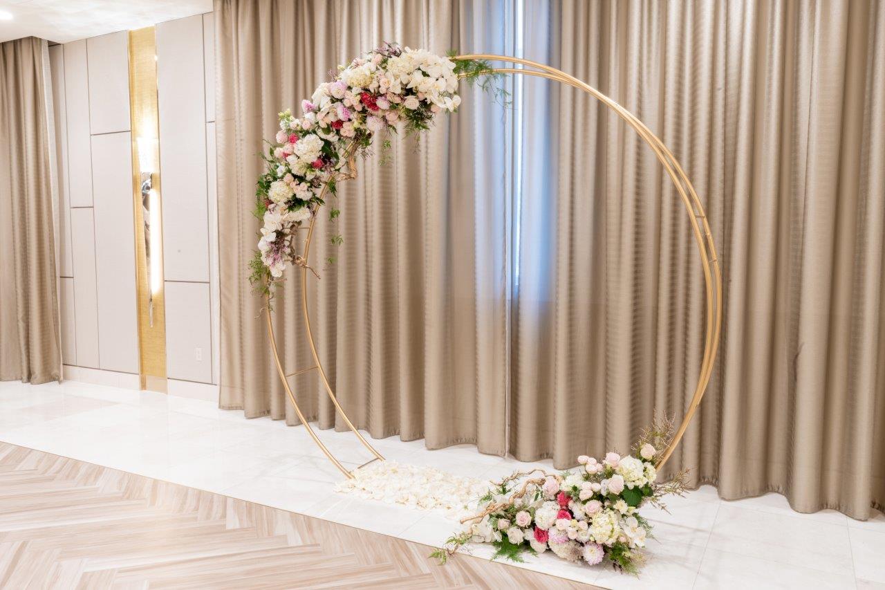 Beautifully decorated 8' tall gold infinity ring with accents of roses, calla lilies, hydrangeas and seasonal flowers in your choice of colors accented on the side and base of the frame.  This backdrop is perfect for weddings, anniversary or engagement celebrations in larger suites or...