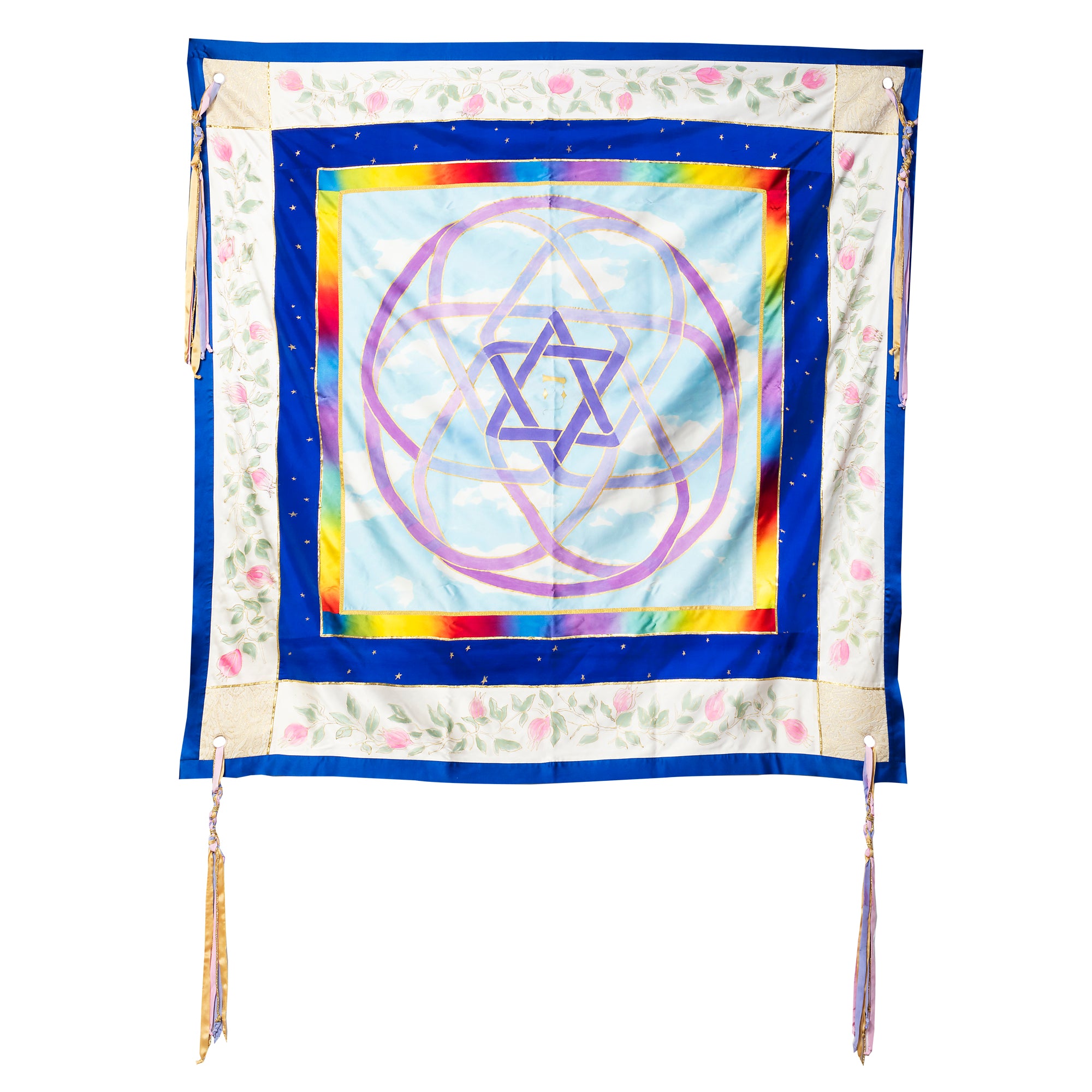 Beautiful 8'H x 8'W x6'D Gold frame Chuppah front is covered with assorted Roses, Sweetheart roses, Hydrangea, Cremones/Dahlias, Seasonal filler flowers and Greenery with Ivory or white tulle drape in the front and back (sides are open) fresh rose petals at the bases and silk Tallis.